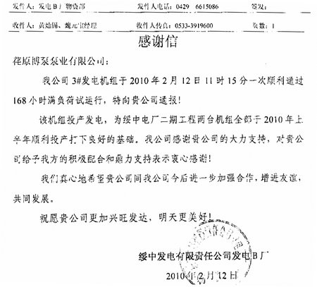 2009年9月27日8時(shí),海門一期4 *1000MW國(guó)產(chǎn)臨界機(jī)組,#2機(jī)圓滿完成了168小時(shí)滿負(fù)荷運(yùn)行,順利投產(chǎn)發(fā)電。海門電廠特地為我公司發(fā)來(lái)感謝函,對(duì)我公司的優(yōu)良服務(wù)表示感謝。海門一期4 *1